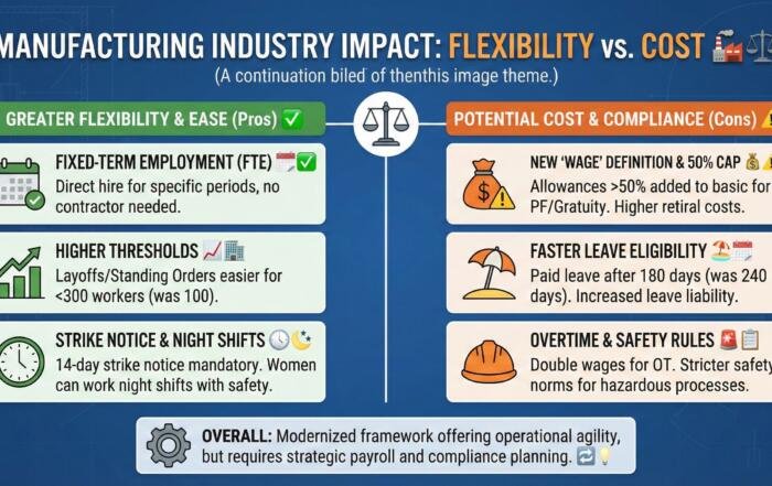 For Manufacturing Industries (factories, foundries, production plants, etc.), the shift to the 4 Labour Codes is a major overhaul. The new system generally offers more operational flexibility (hiring/firing/shifts) but may increase payroll costs due [...]